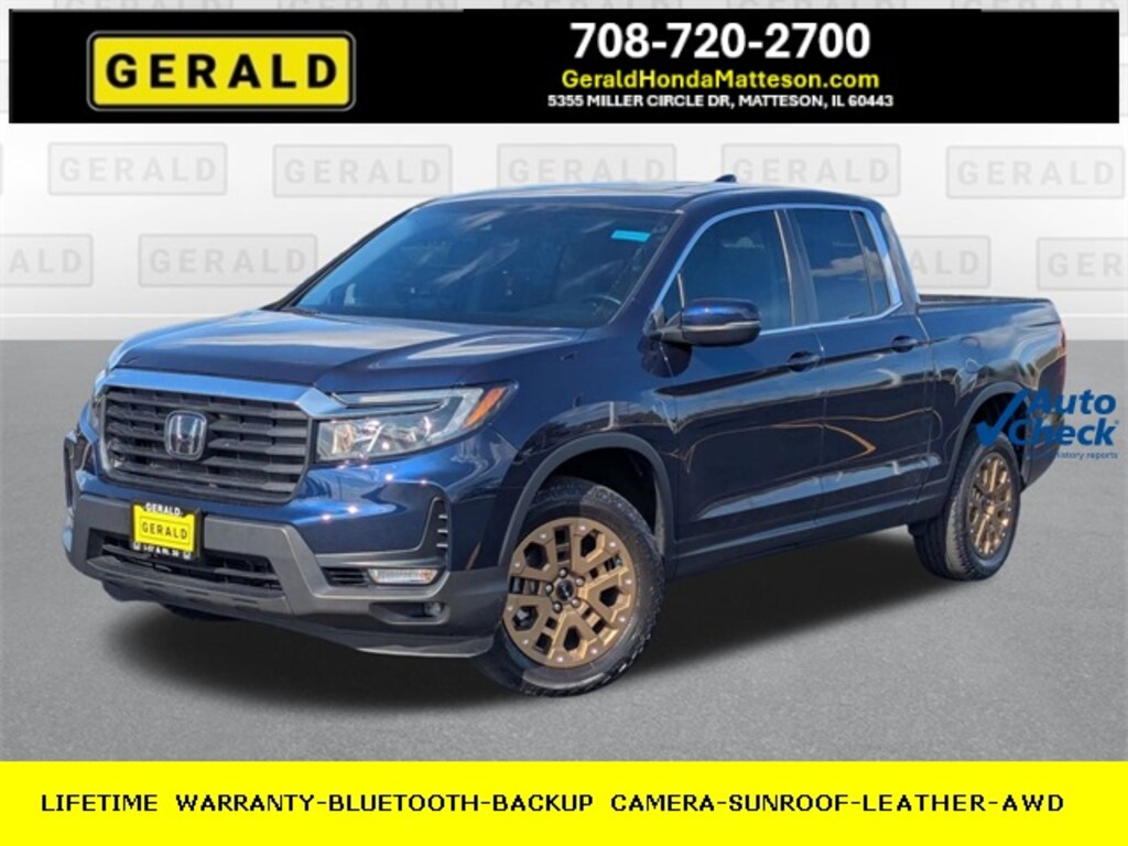 New Price! 2023 Honda Ridgeline RTL AWD Obsidian Blue Pearl * THIS CAR IS LOCATED AT GERALD HONDA OF MATTESON PLEASE CALL US TODAY AT 708.720.2700 TO SEE IT, * CLEAN CARFAX, * APPLE CARPLAY / ANDROID AUTO, *BLUETOOTH, *REAR VIEW CAMERA, *SUNROOF/MOONROOF, *LEATHER INTERIOR, *HEATED SEATS, * AWD, AM/FM radio: SiriusXM.