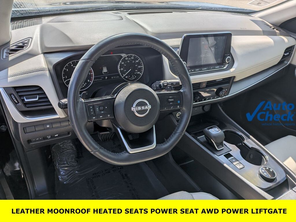 HOME OF THE LIFETIME WARRANTY, AWD, 18" Aluminum Alloy Wheels, 4-Wheel Disc Brakes, 5.604 Axle Ratio, ABS brakes, Air Conditioning, AM/FM Radio, AM/FM radio: SiriusXM, Auto High-beam Headlights, Automatic temperature control, Black Splash Guards (Set of 4), Brake assist, Bumpers: body-color, Cloth Seat Trim, Delay-off headlights, Driver door bin, Driver vanity mirror, Dual front impact airbags, Dual front side impact airbags, Electronic Stability Control, Emergency communication system: NissanConnect Services, First Aid Kit, Floor Mats w/1-Piece Cargo Area Protector, Four wheel independent suspension, Front anti-roll bar, Front Bucket Seats, Front Center Armrest, Front dual zone A/C, Front reading lights, Fully automatic headlights, Heated door mirrors, Heated Driver & Front Passenger Seats, Heated Leather Wrapped Steering Wheel, Illuminated entry, Knee airbag, Leatherette Door Trim Inserts w/Stitch, Low tire pressure warning, NissanConnect featuring Apple CarPlay and Android Auto, Occupant sensing airbag, Outside temperature display, Overhead airbag, Overhead console, Panic alarm, Panoramic Moonroof, Passenger door bin, Passenger vanity mirror, Power door mirrors, Power driver seat, Power Liftgate, Power steering, Power windows, PRIMATEX Leatherette Seat Trim, Radio data system, Rear anti-roll bar, Rear Door Sunshades, Rear Parking Sensors, Rear Personal Lights, Rear seat center armrest, Rear side impact airbag, Rear window defroster, Rear window wiper, RearView Monitor, Remote keyless entry, Retractable Cargo Cover, Security Alarm, Silver Painted Roof Rails, Speed control, Speed-Sensitive Wipers, Split folding rear seat, Spoiler, Steering wheel mounted audio controls, SV Premium B Package, Tachometer, Telescoping steering wheel, Tilt steering wheel, Traction control, Trip computer, Variably intermittent wipers. Clean CARFAX. 28/35 City/Highway MPG Odometer is 1386 miles below market average!