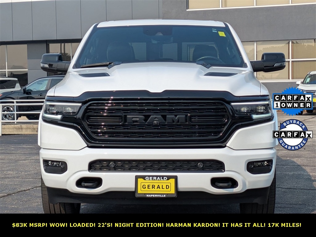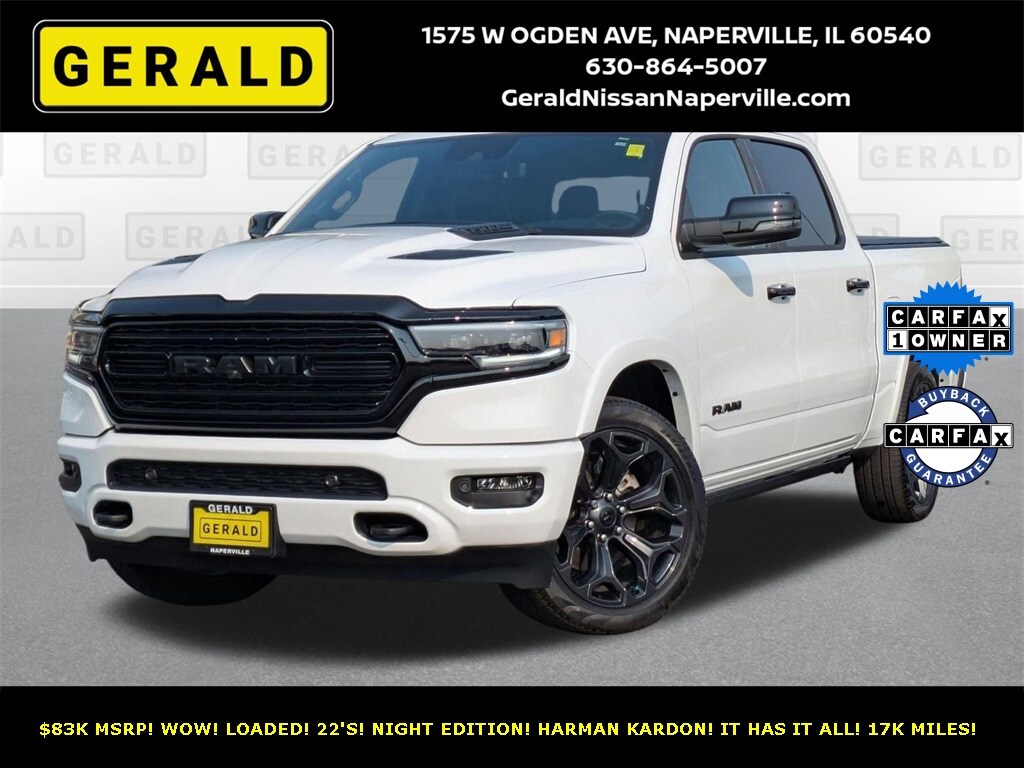 WOW! $83K MSRP! 1 OWNER! ONLY 17K MILES! RAM LIMITED! LIFETIME WARRANTY! 22" WHEELS! LIMITED LEVEL 1 PACKAGE WITH ADAPTIVE CRUISE, 360 CAMERA, LED LIGHTING, MOPAR SPRAY IN BEDLINER, 19 SPEAKER HARMON KARDON AUDIO, HEADS UP DISPLAY, LANE KEEP ASSIST, AND A DIGITAL REAR VIEW MIRROR! NIGHT EDITION WITH TRI FOLD COVER, BODY COLORED FRONT AND REAR BUMPERS, SPORT HOOD, BLACK BADGING, AND A BLACK GRILLE! TRAILER TOW GROUP WITH TRAILER REVERSE STEERING CONTROL, TRAILER BRAKE, AND TRAILER TIRE PRESSURE MONITOR! ALL THIS WITH THE LEGENDARY 5.7 LITER HEMI V8! DON'T WAIT! $AVE THOUSANDS VS NEW! COME SEE US AT GERALD NISSAN OF NAPERVILLE TODAY!!!