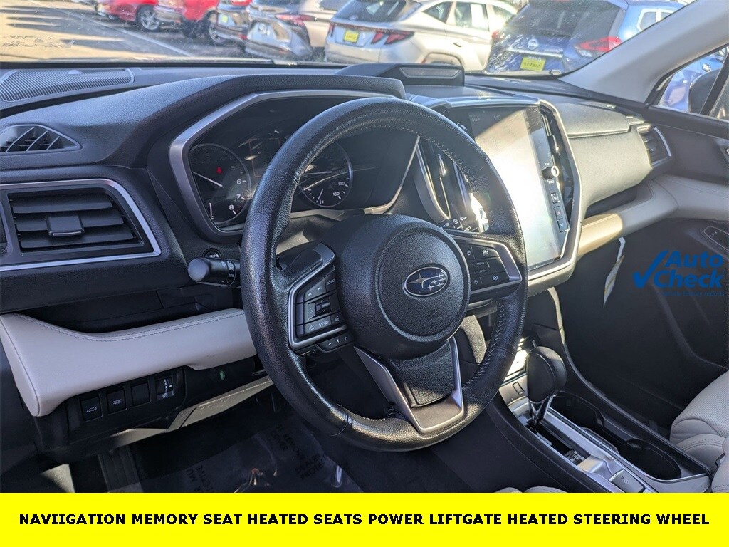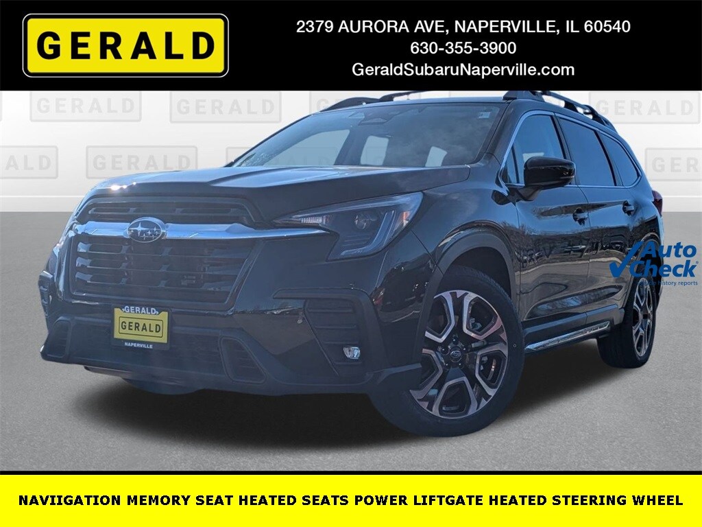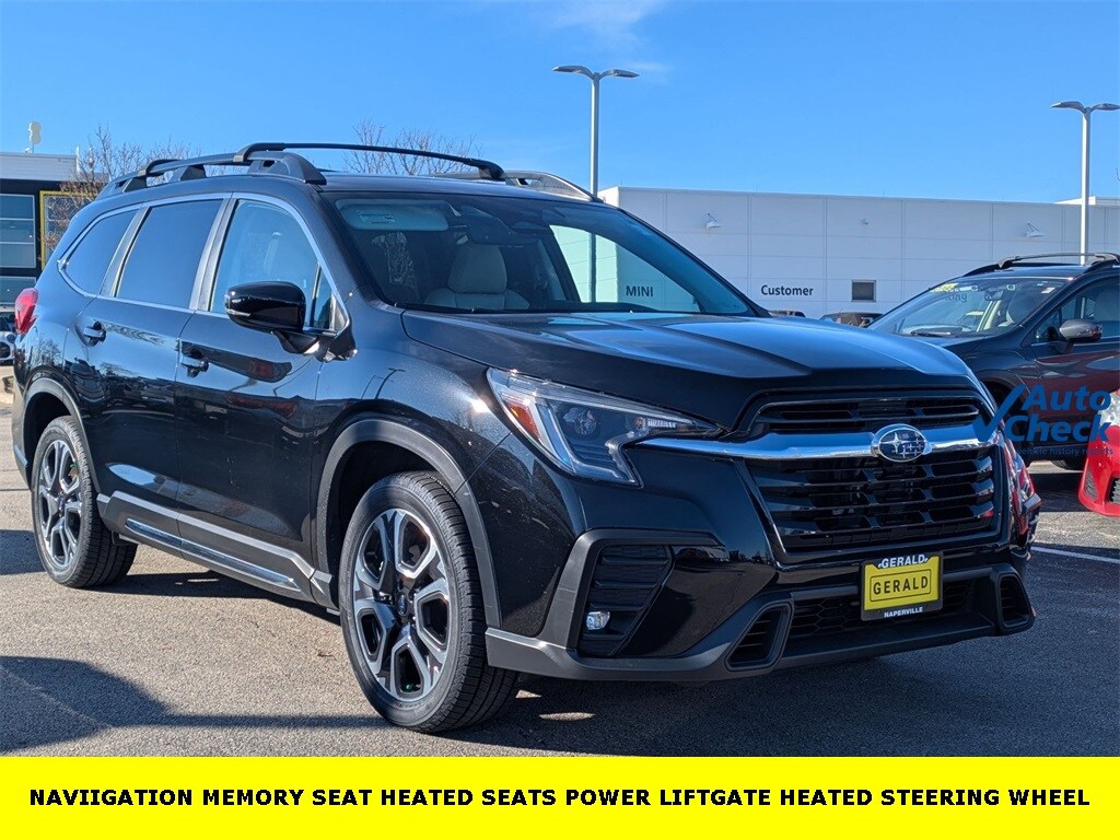 HOME OF THE LIFETIME WARRANTY, 3rd Row Sunshade, 4-Wheel Disc Brakes, ABS brakes, Aero Crossbar Set, Air Conditioning, All-Weather Floor Liners, Alloy wheels, AM/FM radio: SiriusXM, Auto High-beam Headlights, Auto-dimming Rear-View mirror, Automatic temperature control, Brake assist, Bumpers: body-color, Cargo Net, Cargo Tray, Compass, Delay-off headlights, Driver door bin, Driver vanity mirror, Dual front impact airbags, Dual front side impact airbags, Electronic Stability Control, Emergency communication system: STARLINK Safety and Security (Subscription Required), Exterior Parking Camera Rear, Four wheel independent suspension, Front anti-roll bar, Front Bucket Seats, Front Center Armrest, Front dual zone A/C, Front fog lights, Front reading lights, Fully automatic headlights, Garage door transmitter: HomeLink, Heated door mirrors, Heated Front Bucket Seats, Heated front seats, Heated rear seats, Heated steering wheel, HVAC memory, Illuminated entry, Knee airbag, Leather Shift Knob, Leather steering wheel, LED Upgrade, Low tire pressure warning, Memory seat, Occupant sensing airbag, Outside temperature display, Overhead airbag, Overhead console, Panic alarm, Passenger door bin, Passenger vanity mirror, Perforated Leather-Trimmed Upholstery, Power door mirrors, Power driver seat, Power Liftgate, Power passenger seat, Power steering, Power windows, Radio: Subaru STARLINK 11.6" Multimedia Plus System, Rear air conditioning, Rear anti-roll bar, Rear Bumper Cover, Rear reading lights, Rear seat center armrest, Rear window defroster, Rear window wiper, RearView Monitor, Reclining 3rd row seat, Remote keyless entry, Security system, Speed control, Speed-sensing steering, Split folding rear seat, Spoiler, Standard Model, STARLINK/Apple CarPlay/Android Auto, Steering wheel mounted audio controls, Tachometer, Telescoping steering wheel, Tilt steering wheel, Traction control, Trip computer, Turn signal indicator mirrors, Variably intermittent wipers.