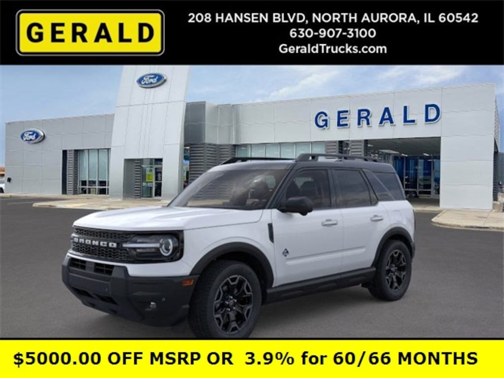 * Body-color door handles, black grille with “BRONCO” styling, roof‑rack side rails