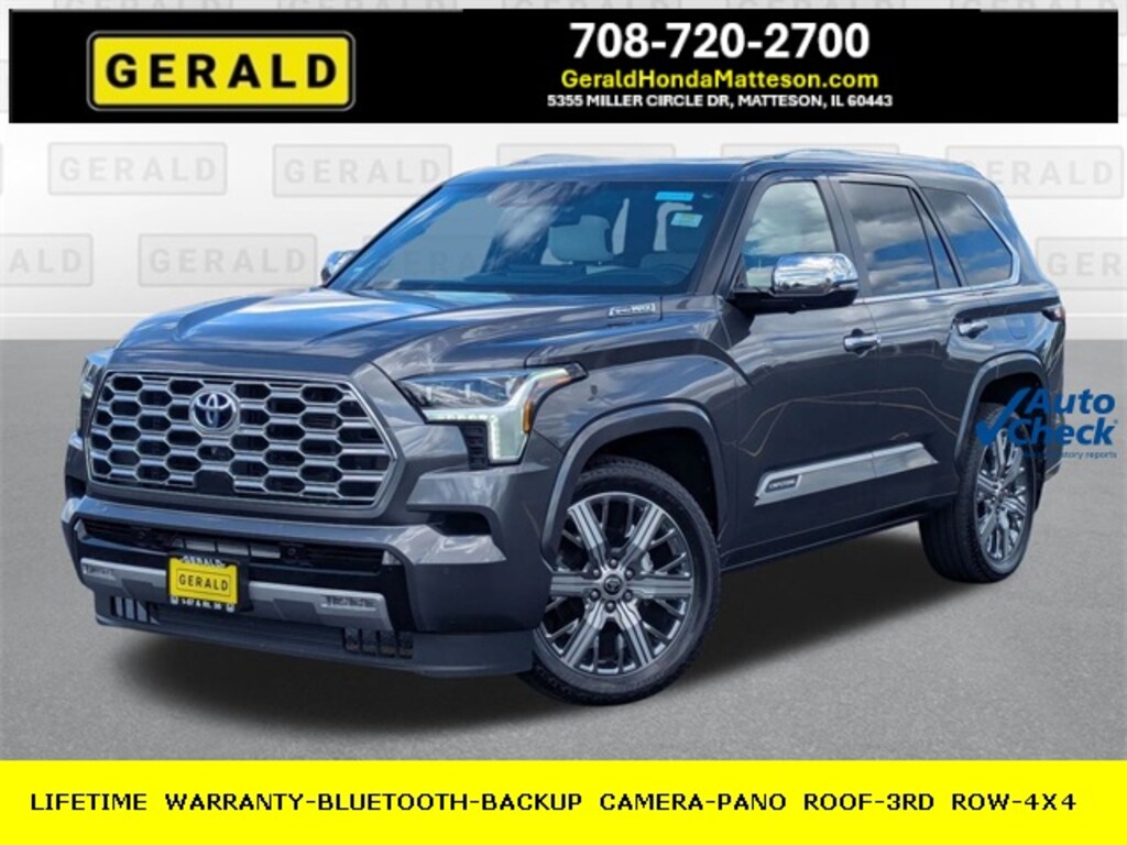 2024 Toyota Sequoia Capstone 4WD Magnetic Gray Metallic * THIS CAR IS LOCATED AT GERALD HONDA OF MATTESON PLEASE CALL US TODAY AT 708.720.2700 TO SEE IT, * LIFETIME WARRANTY, *ONE OWNER, * APPLE CARPLAY / ANDROID AUTO, *BLUETOOTH, *REAR VIEW CAMERA, * PANORAMIC ROOF, *LEATHER INTERIOR, *HEATED SEATS, *4X4, ABS brakes, Active Cruise Control, Alloy wheels, Apple CarPlay/Android Auto, Auto High-beam Headlights, Auto tilt-away steering wheel, Auto-dimming door mirrors, Auto-dimming Rear-View mirror, Automatic Power Extending Running Boards, Compass, Delay-off headlights, Electronic Stability Control, Exterior Parking Camera Rear, Front dual zone A/C, Front fog lights, Fully automatic headlights, Headlight cleaning, Heads-Up Display, Heated & Ventilated Front Seats, Heated door mirrors, Heated front seats, Heated Power Auto-Dimming Outside Mirrors, Heated rear seats, Illuminated entry, Low tire pressure warning, Memory seat, Navigation System, Power Liftgate, Power moonroof, Remote keyless entry, Semi-Aniline Leather Seat Trim, Traction control, Wheels: 20" Machined-Finish Black Alloy.